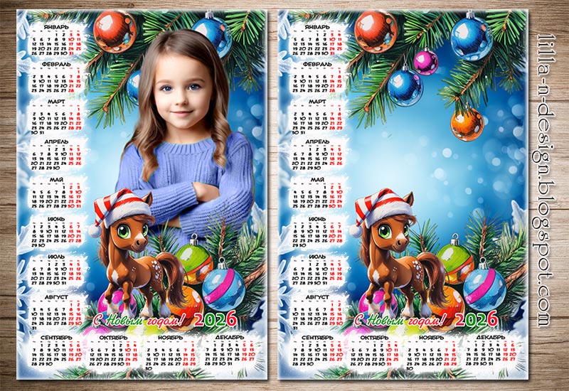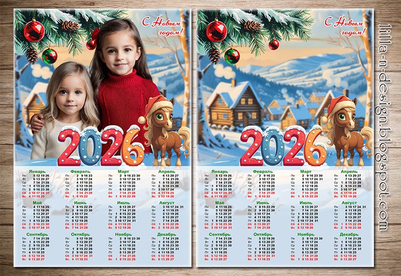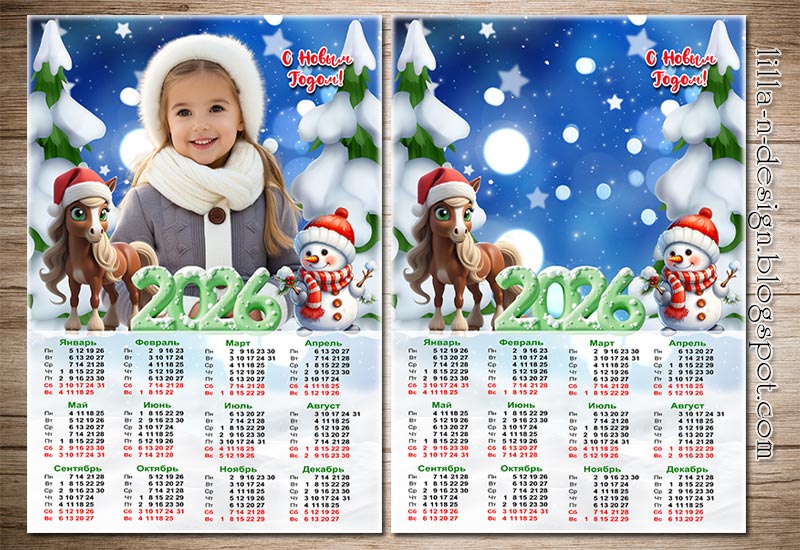 Календарь на 2026 год с символом год Лошадью Снежная зима